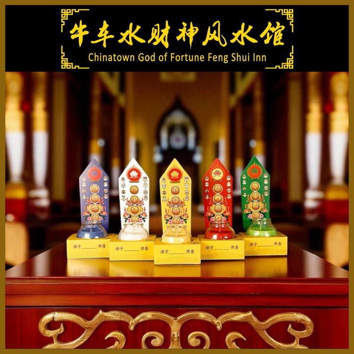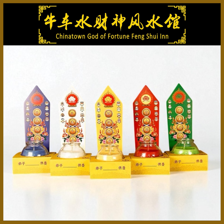 🌎供奉点灯 ——五色蜡烛将于本店 财神神坛 前点燃,配合香火祈福,将祝福传递给您。